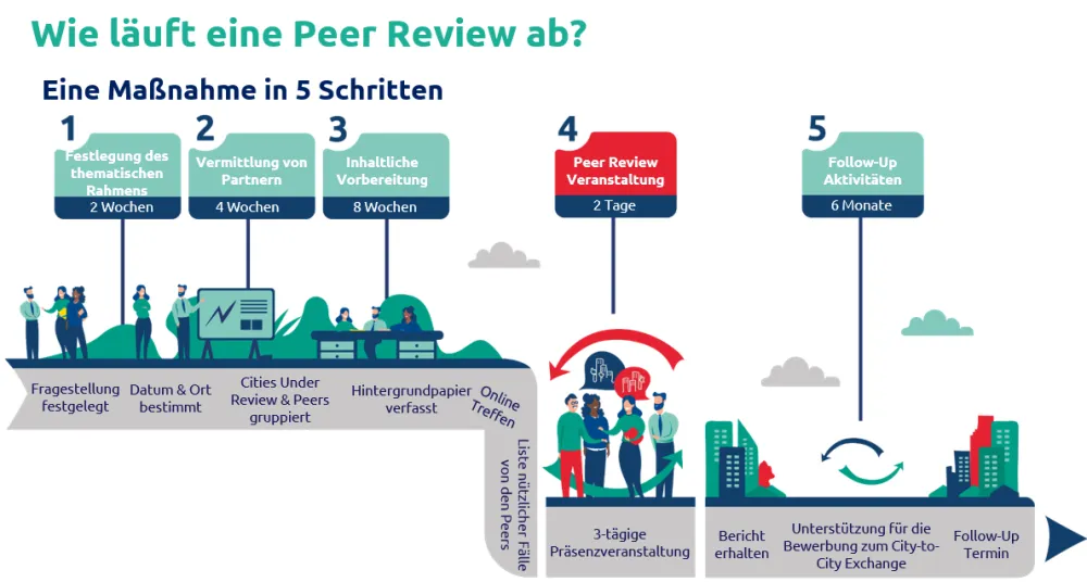 Bei einer Peer Review arbeiten sogenannte Artikel-11-Städte mit Expert:innen aus bis zu sechs Städten zusammen, die sie als "Peers" unterstützen. Das gemeinsame Ziel: Die gemeinsame Diskussion und Weiterentwicklung einer wirksamen, nachhaltigen Stadtentwicklungsstrategie.