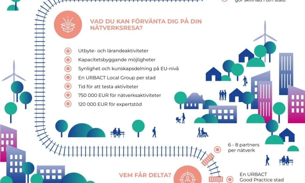 Nu har ni chans att delta i en kunskapsöverföring från någon av de 116 städer som URBACT utsett som goda exempel. Din stad kan delta i ett nätverk där ni med hjälp av beprövade metoder och en, av URBACT utsedd expert, för över kunskap och erfarenhet till din stads situation och kulturella förutsättningar.Detta ger dels möjlighet med tid och medel att ta del av testad kunskap inom ett område som din stad vill ta steg framåt inom. Ni kommer också att få möjlighet att inom ramen för nätverket testa aktiviteter och formera en lokal grupp som kommer kunna ta er kunskap vidare.Målet efter att ni deltagit i nätverket är att ni har en färdig plan för hur ni ska implementera den kunskap ni tagit till er i er stad.Här kan du läsa mer och ta del av
